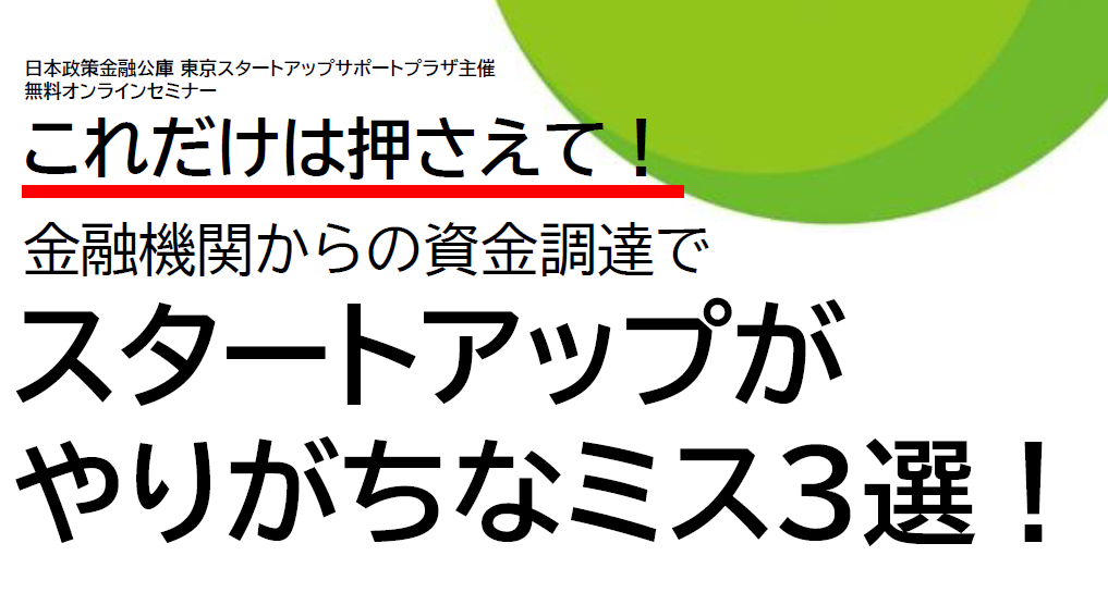 【オンライン開催】「これだけは押さえて!金融機関からの資金調達でスタートアップがやりがちなミス3選!」のご案内