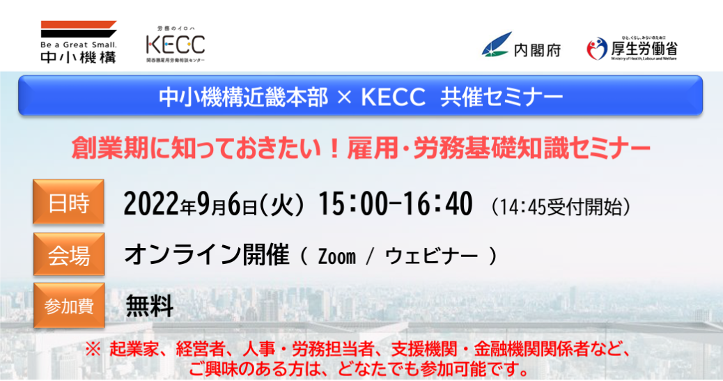 中小機構近畿本部等主催「創業期に知っておきたい!雇用・労働基礎知識セミナー」のご案内